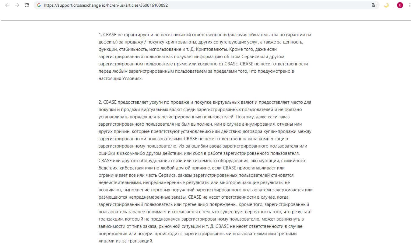 Мошенническая компания Кросс Эксчэндж предоставила на своём интернет ресурсе некое клиентское соглашение, которое выглядит как обычное клиентское соглашение, которое используется на мошеннических сайтах, в котором с начало очень много обещают, а затем упоминают, что они никакой ответственности не несут, и снимают все обязательства с себя.
