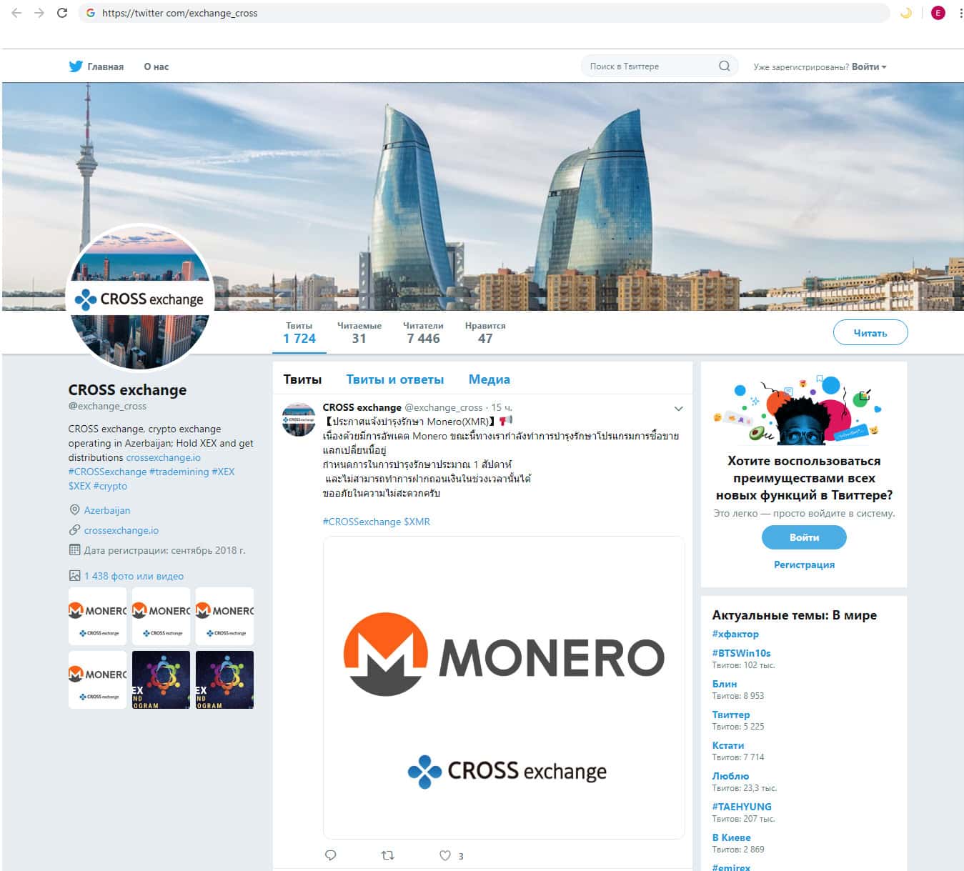 Мошенники Кросс Эксчэндж коснулись даже социальных сетей. У конторы аферистов есть своя страничка в твитере, где они пропагандируют свою торговлю, и пытаются завлечь большую аудиторию неопытных трейдеров, так как это именно их целевая аудитория, так как опытный человек сразу заметит все подвохи и недочёты мошенников.