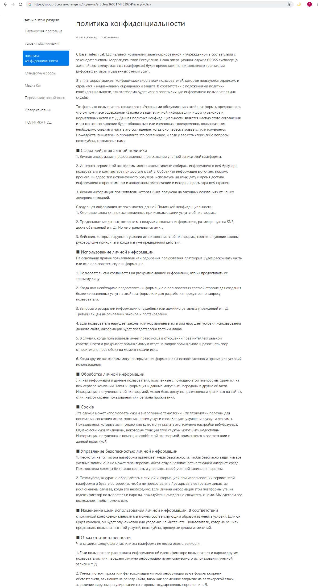 Лохотрон Кросс Эксчэндж предоставляет нам самую посредственную политику конфиденциальности, в которой они говорят, что будут оберегать ваши данные, что они под защитой, но будут передавать их якобы доверенным людям, и всё буд то это делается для вашего успеха и блага, но 100% безопасность они не гарантируют.