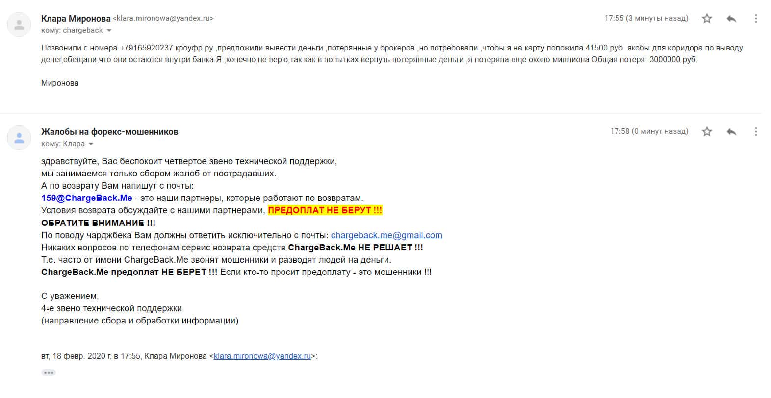 Одна женщина рассказала, что ей позвонили с телефона и предложили вывести деньги, которая она ранее потеряла у брокеров. Сумма потерь на то время составляла 3 000 000 рублей. Шулера из КРОУФР попросили заплатить им 41500 рублей наперед и они якобы должны будут все вернуть, но так ничего и не произошло.