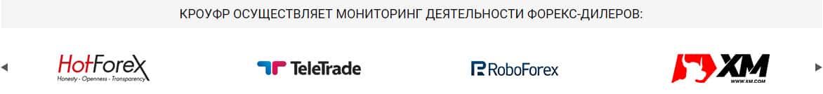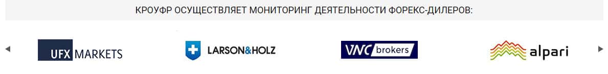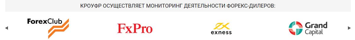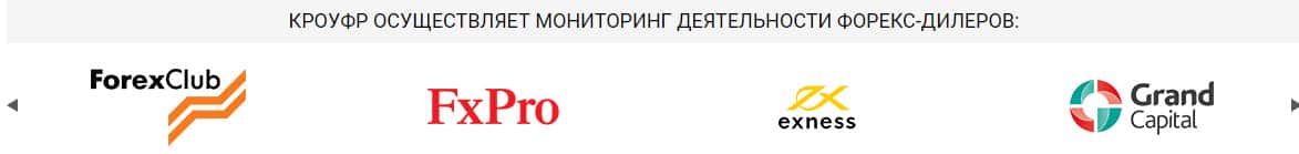 Затем речь идет о том, что иллюзорный регулятор KROUFR Ru осуществляет мониторинг деятельности следующих форекс дилеров: FXPro, ForexClub, Grand Capital, Exness, ТелеТрейд и другие. Все эти форекс брокеры известны своими многочисленными аферами и кидаловом несчастных биржевых трейдеров. В общем, данная шарага просто крышует аферистов.