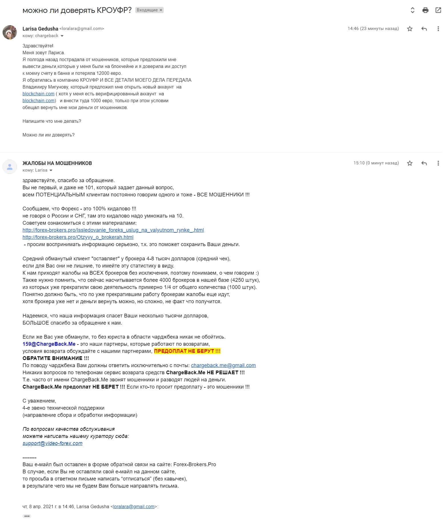 - Жалоба на шулеров КРОУФР и Блокчейн Ком, которые кинули клиентку на 12 000 евро