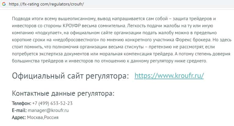 При проведение достаточно обширного обзора регулирования, полномочий и основных целей липовой финансовой конторы KROUFR Ru, сотрудники известного портала fx-rating com пришли к негативному выводу о том, что защита трейдеров и инвесторов со стороны КРОУФР весьма сомнительна. Они скорее станут на защиту мошеннических брокеров, которых крышуют.