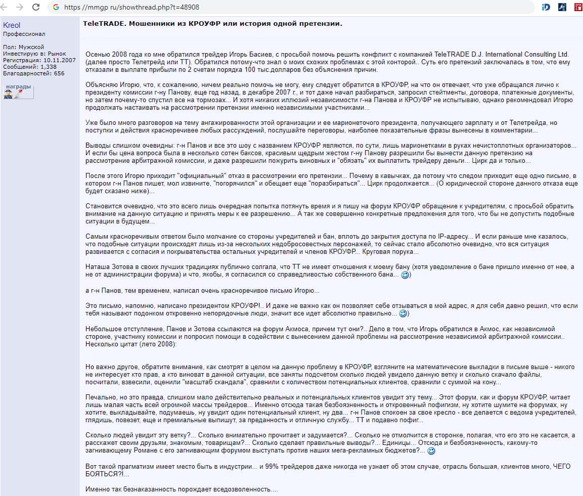 - Злодейский форекс брокер Теле Трейд полностью оправдывает свои преступления псевдоконторой КРОУФР
