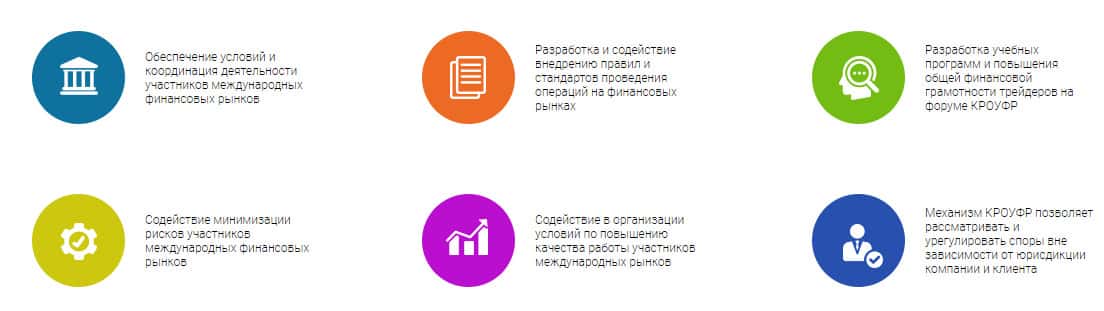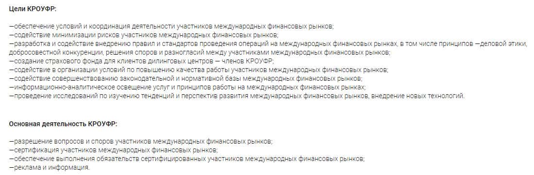 На следующей странице интернет-проекта подставного регулятора KROUFR Ru посвящен описанию целей лживой конторы, все также оформлено весьма радужно и красочно. Целью псевдорегулятора является якобы обеспечение условий и координация деятельности участников международных финансовых рынков. На самом деле, они работают только во благо шулеров.