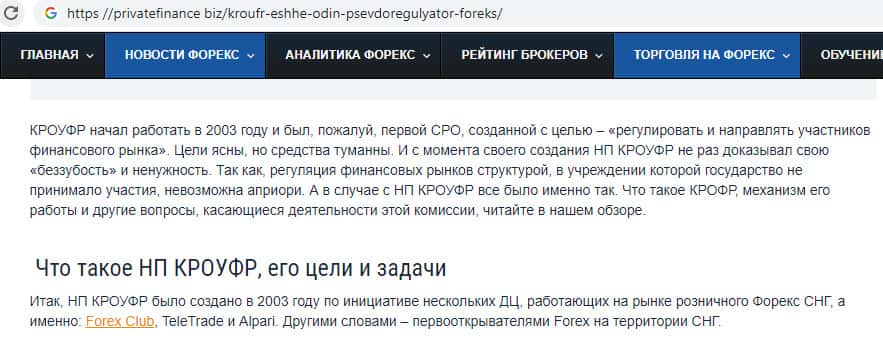 Сотрудники уважаемого ресурса privatefinance biz рассказывают о том, что ложная структура KROUFR Ru создавалась с целью «регулировать и направлять участников финансового рынка». На практике же получилось совсем обратное: с момента создания лжерегулятор не разрулил ни единого инцидента, показывая тем самым свою "ненужность".