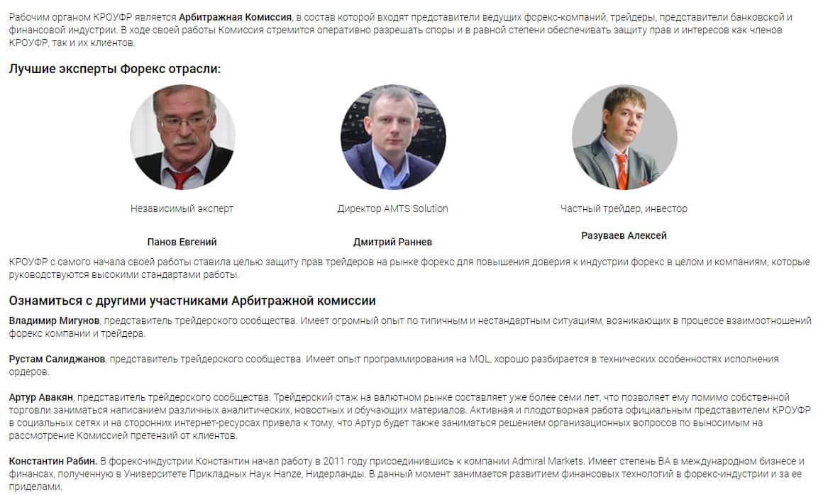 На официальном интернет-сайте указано, что рабочим органом КРОУФР является Арбитражная Комиссия, в состав которой входят представители ведущих форекс-компаний, трейдеры, представители банковской и финансовой индустрии. Мы можем только предполагать, что эти лица причастны к этой поддельной организации. Значит, по порядку: