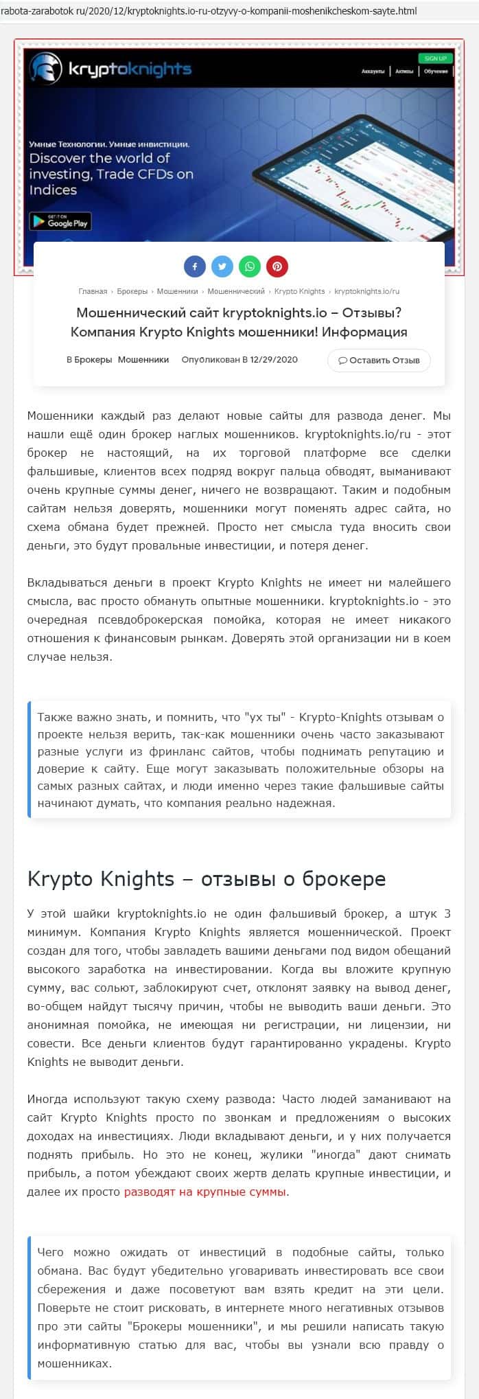 "Проект Krypto Knights создан для того, чтобы завладеть вашими деньгами под видом обещаний высокого заработка на инвестировании" - предупреждает портал rabota-zarabotok ru.