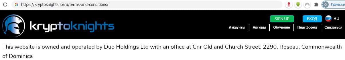 По заявлению мошенников юридическим лицом жульнического брокерского проекта Krypto Knights является компания Duo Holdings LTD, зарегистрированная в государстве Доминика.