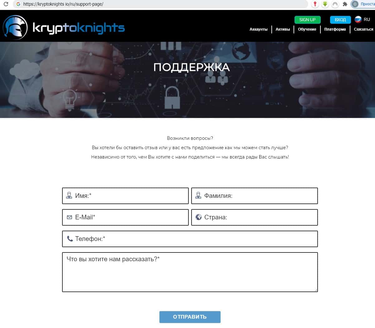 Страница технической поддержки торговой площадки Krypto Knights начинается с привычной формы обратной связи, выдуманной с одной целью сбора контактно информации.