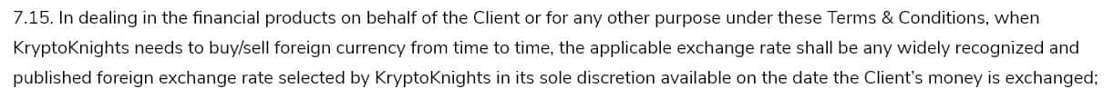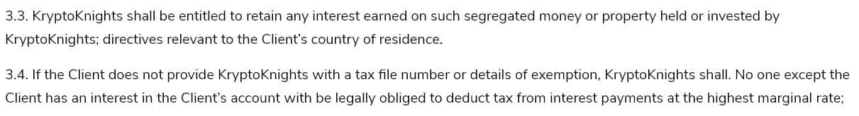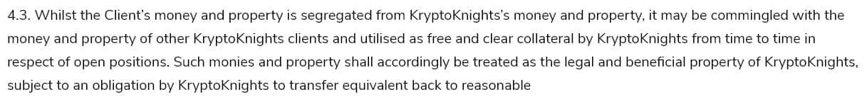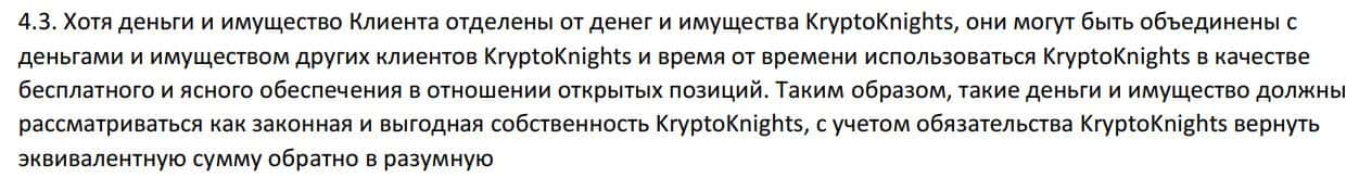 В пунктах, посвященных использованию сегрегированных счетов на торговой площадке KryptoKnights io, имеются оговорки о использовании средств клиента компанией.