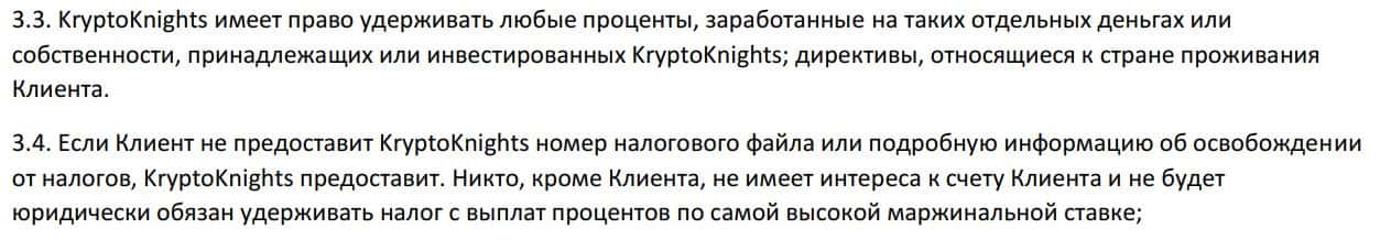 По заявлениям в п. 3.3, 3.4 брокер KryptoKnights io озабочен уплатой налогов клиента в стране проживания клиента и требует от него предоставления налоговых деклараций.