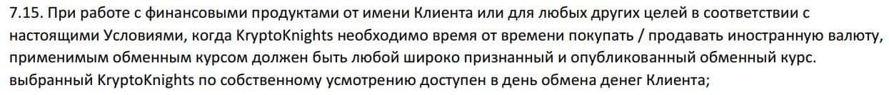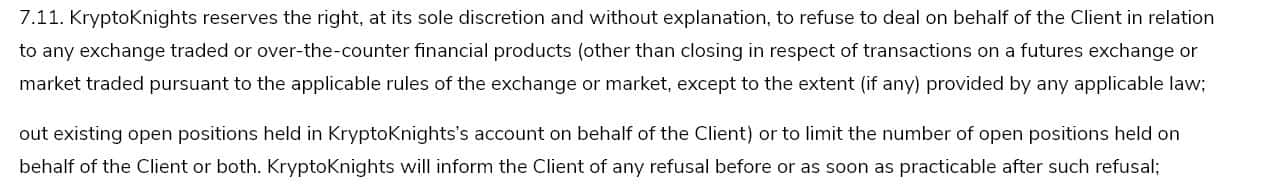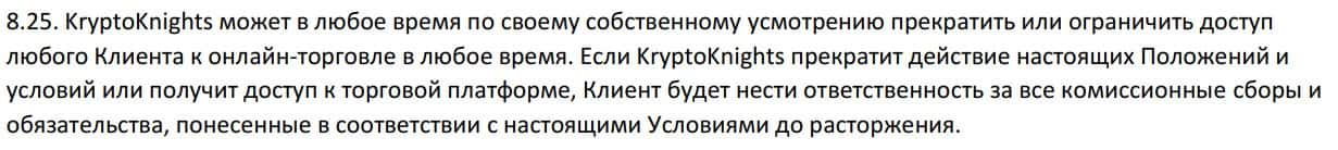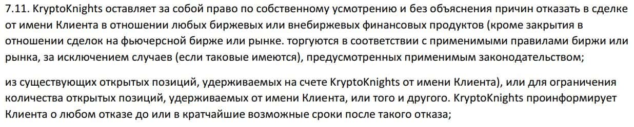 В п.7.11 администрация торговой площадки предупреждает клиента, что если он вступает в противоречие с интересами брокерской компании KryptoKnights io, она вольна закрыть его сделку.