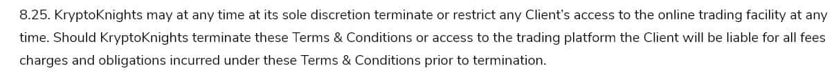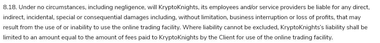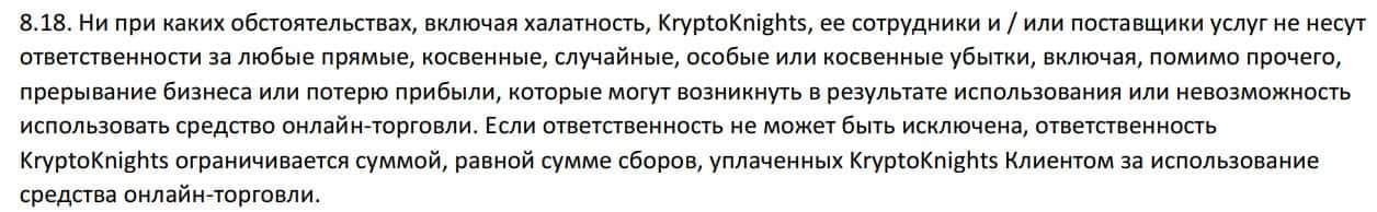 В п. 8.18 оговорено, что ни при каких действиях компании, включая халатность её сотрудников, брокерская площадка KryptoKnights io не несёт ответственности перед клиентом.