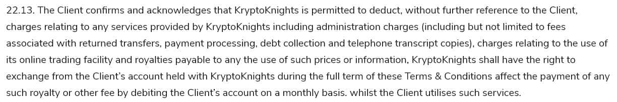 В п.22.13 клиент принимает то факт, что администрация может использовать средства клиента для уплаты различного рода административных сборов и выплат.