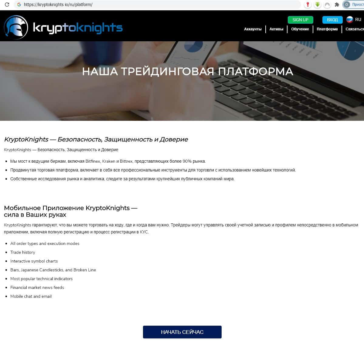 О торговой платформе на брокерской площадке KryptoKnights io умалчивают до самой регистрации, лишь убеждают в её преимуществах над другими и наличии мобильной версии.