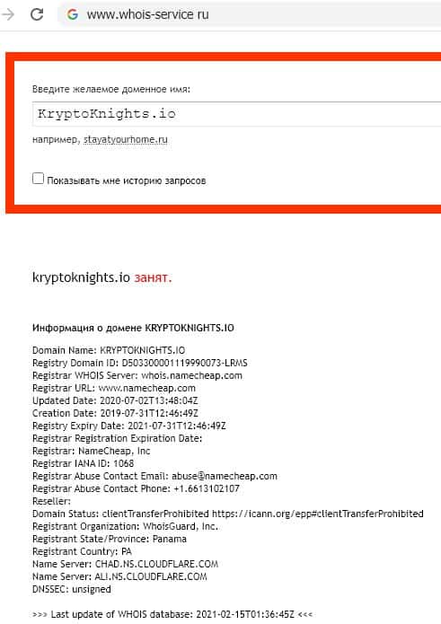 Как и следовало ожидать, аферисты из брокерской конторы KryptoKnights io при регистрации своего домена засекретили всю информацию, могущую так или иначе привести к ним.
