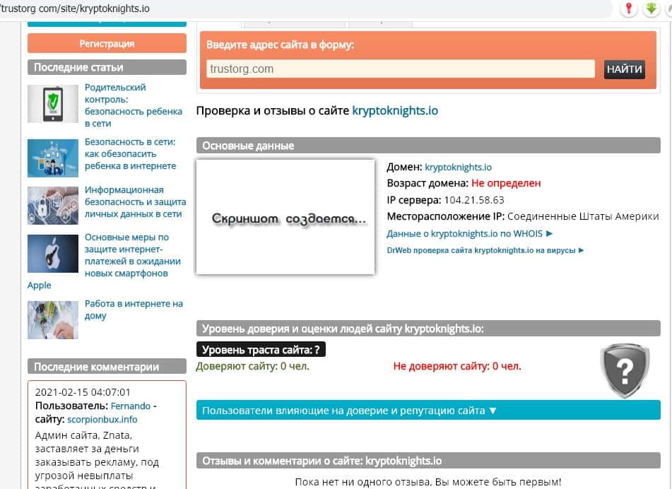 - Оценка доверии к сайту лжеброкера KryptoKnights io на портале trustorg