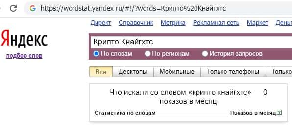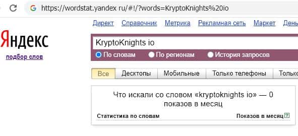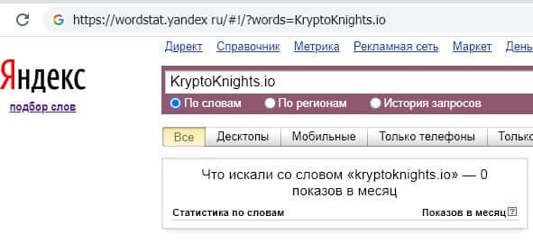 Ответ поисковой системы Яндекс по количеству запрошенных за месяц поисковых запросов торговой площадки "KryptoKnights io" составил ни много, ни мало, а целый ноль.