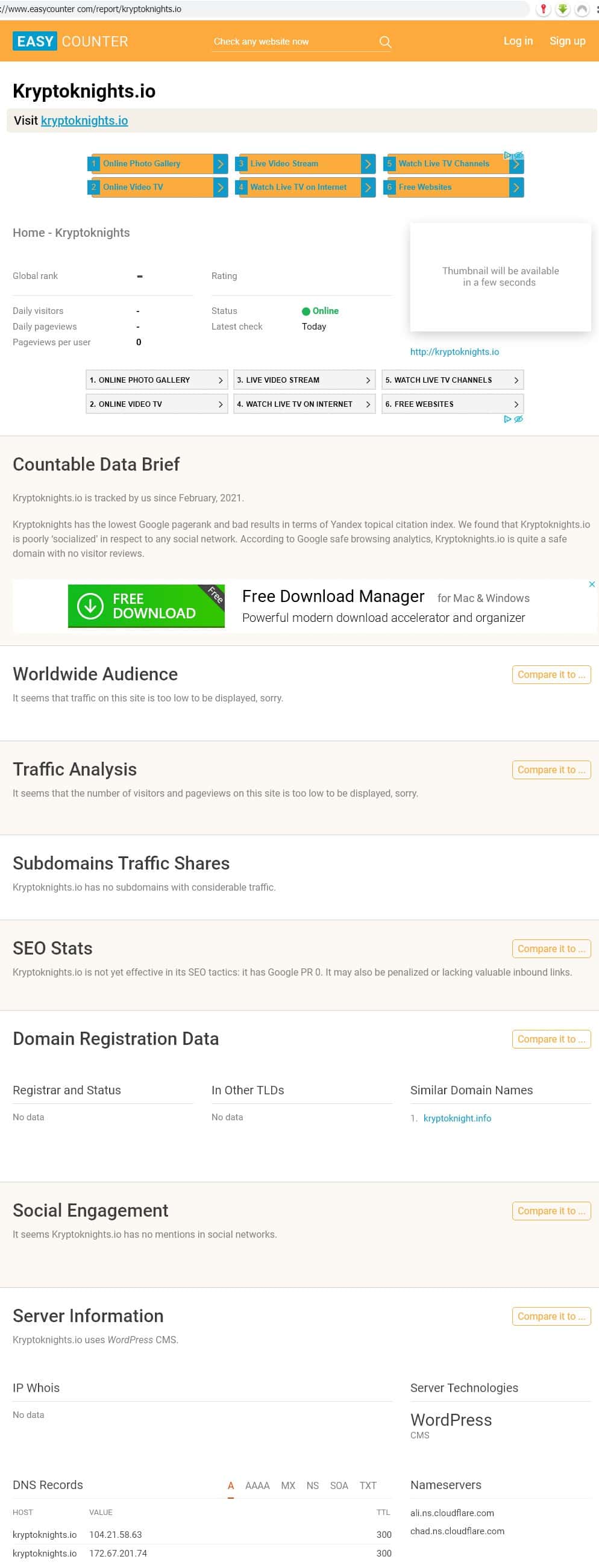 Не проливает свет на деятельность и характеристики трафика брокерской конторы KryptoKnights io и попытка его анализа, проведенная службами портала easycounter.