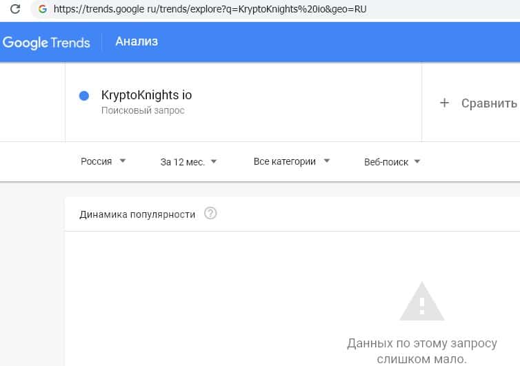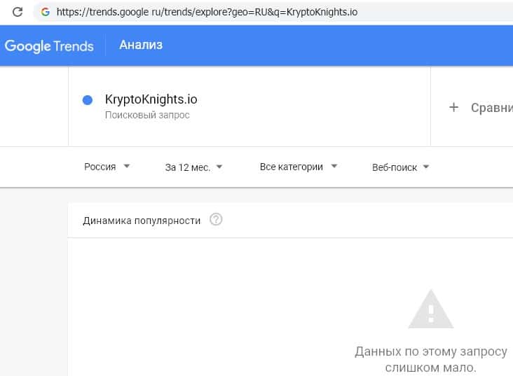 В американской поисковой системе Гугл слишком мало данных для анализа популярности брокерской конторы "KryptoKnights io" посредством поисковых запросов.