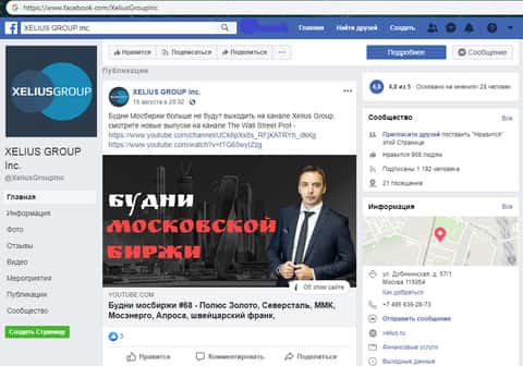 Дабы соответствовать современным трендам аферисты Xelius обзавелись страницами в различных социальных сетях, одной из которых стал Facebook, где мошенники Кселиус имеют всего тысячу подписчиков, которые не проявляют никакой активности на странице лохотрона Xelius в Фейсбук, что вы можете увидеть на изображении, расположенном ниже.