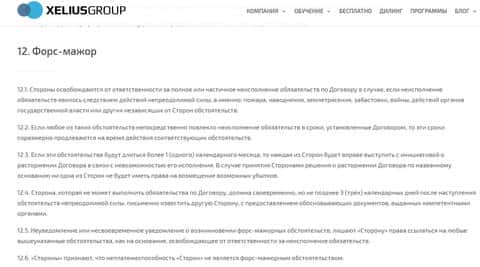 Ну а завершается клиентское соглашение у мошенников Кселиус на волне того, что аферисты Xelius не несут никакой ответственности еще и в случае форс-мажорных обстоятельств, которые могут возникать по ходу сотрудничества с шулерами Кселиус. На изображении, расположенном ниже, вы можете увидеть окончание условий сотрудничества аферистов Xelius.