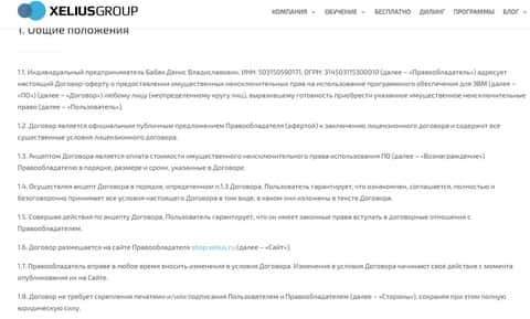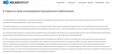 Далее в клиентском соглашении аферистов Xelius следует условие о том, что аферисты Кселиус не несут никакой ответственности за возможные потери клиента, связанные с использованием программного обеспечения от лохотрона Xelius. На изображении, расположенном ниже, вы можете увидеть очередной раздел условий сотрудничества аферистов Кселиус.