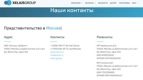 Под свои контакты мошенники Xelius отвели отдельный раздел своего подвального сайта, в котором аферисты Кселиус перечислили достаточное количество контактов, что для подобной конторы является нормой, ведь шулера Xelius как раз таки и зарабатывают на общении с клиентами и впариванию им курсов. Ниже перечислим указанные жуликами Кселиус контакты: