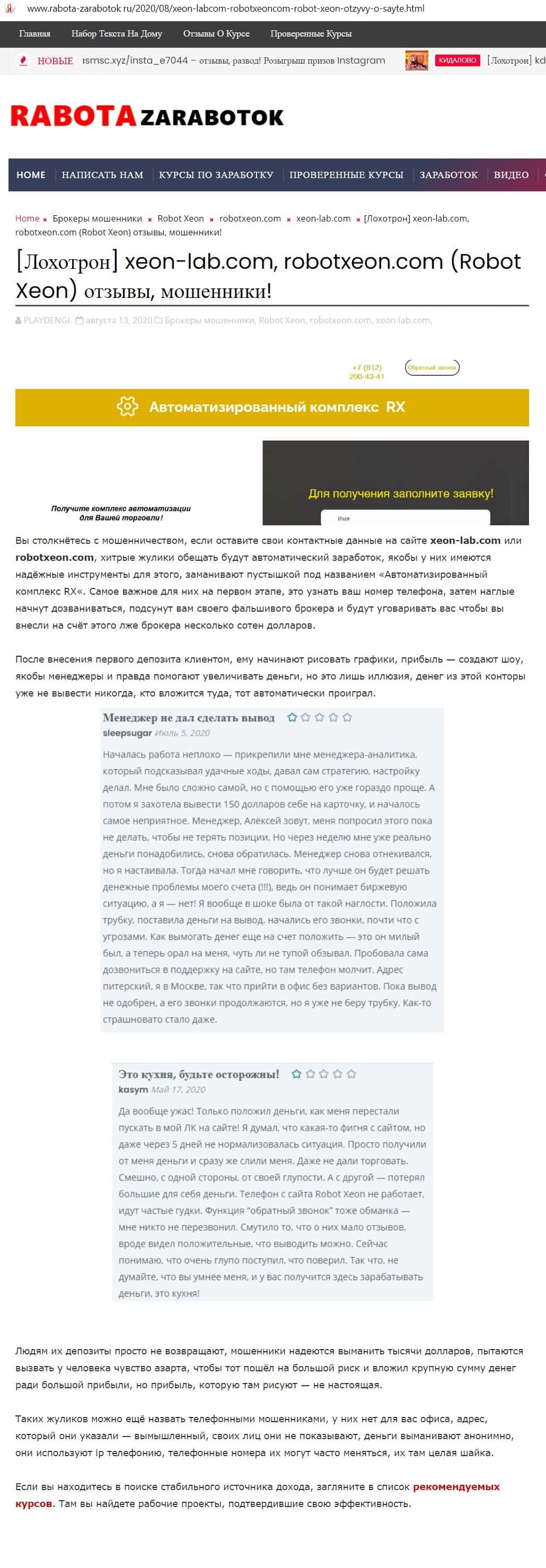 Сайт Работазаработок назвал сайт Ксеон Лаб пустышкой, где не только нельзя заработать, но и с великой вероятностью можно потерять средства, связываться с ним нельзя.