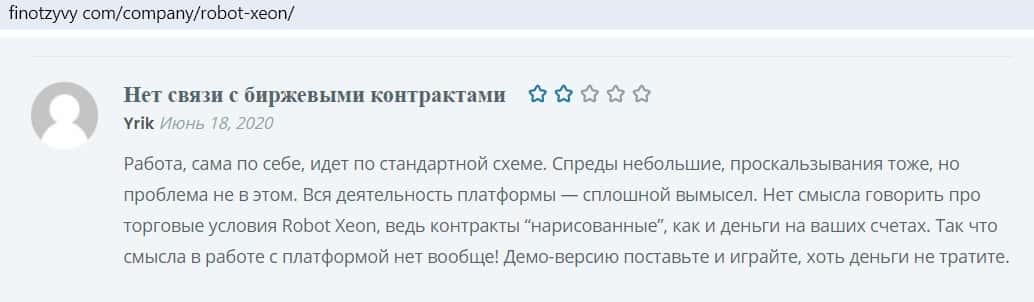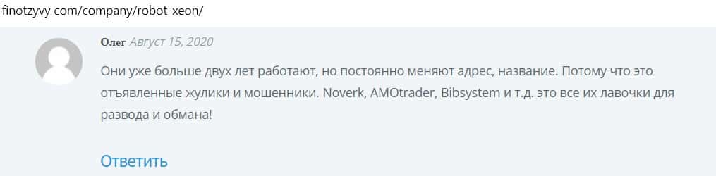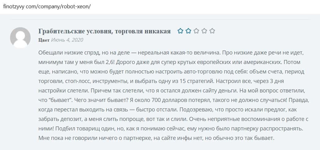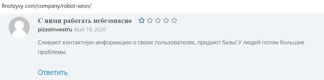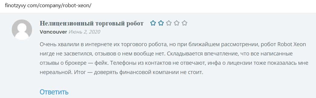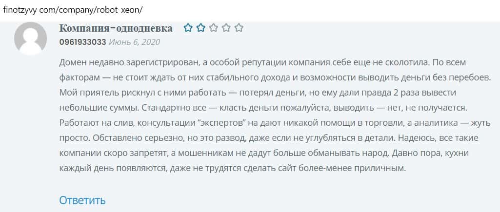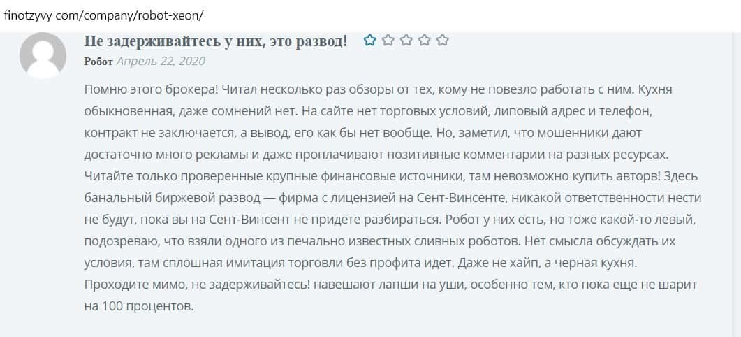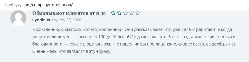 Другой пользователь пишет, что робот, которым торгуют мошенники, сливной, так как компания фальшивая, не имеющая лицензии.