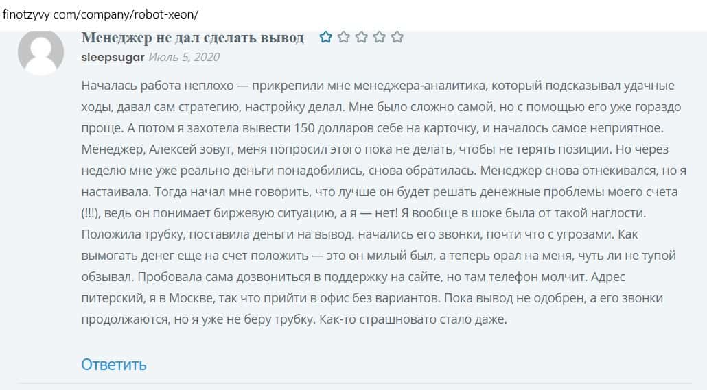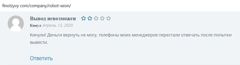 Мужчина написал отзыв о мошеннической конторе Ксеон Лаб, что его кинули на деньги, менеджеры перестали отвечать ему после попытки вывести средства.