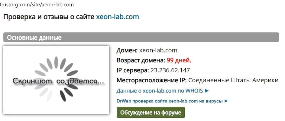 Возраст доменного имени сайта xeon-lab com составляет 99 дней. Это очень маленький срок, поэтому контора не может внушать сильного доверия.
