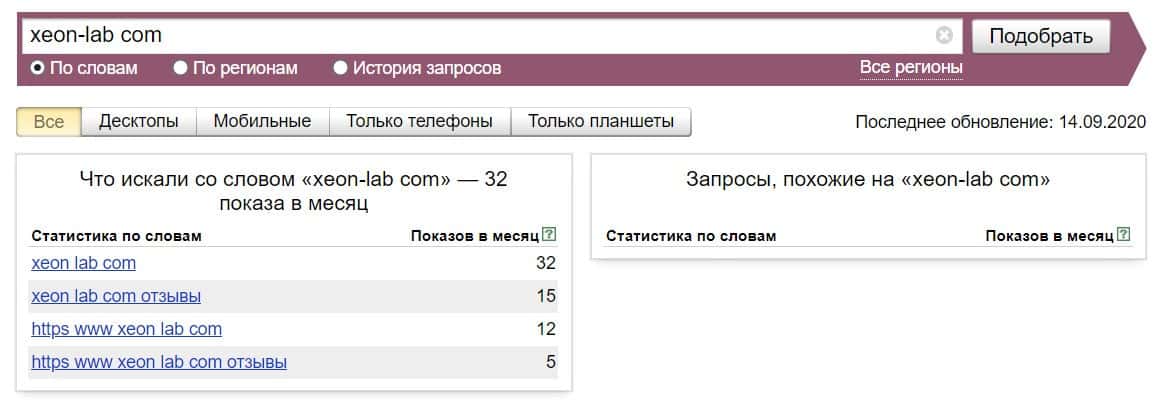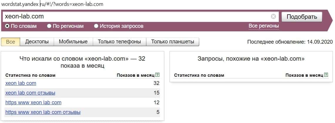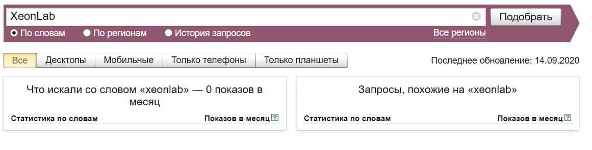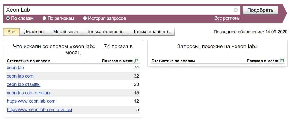 Посмотрим, сколько раз люди искали название бренда "Ксеон Лаб" на русском языке с пробелом: 0 раз за месяц.