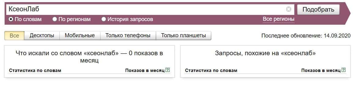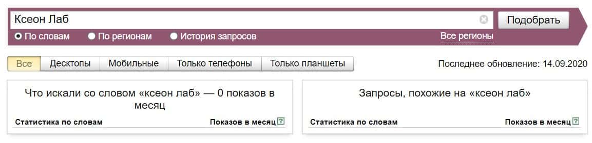 Название бренда на русском языке без пробела "КсеонЛаб", пользователи не искали в системе Яндекс ни разу.