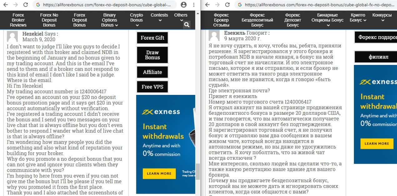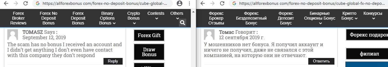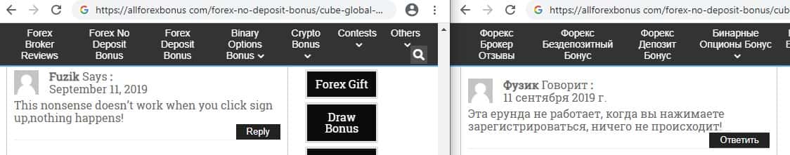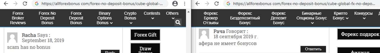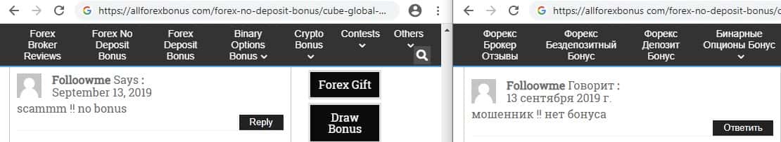 Бонусная система которой хвастается подвальная кухня Куб Глобал ФХ самый настоящий обман о чём говорит нам один из пользователей портала allforexbonus com обманутый ранее лохотроном CubeGlobalFX и предупреждающий людей которые захотят воспользоваться призрачными бонусами о том, что не нужно им доверять.