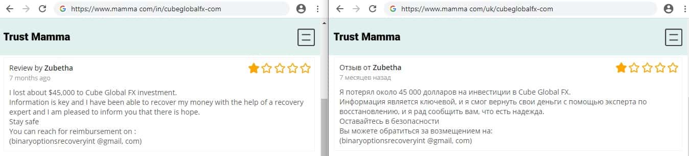 Если вы захотите пожаловаться или просто уточнить интересующую вас информацию, просто забудьте об этом, так как лохотрон CubeGlobalFX игнорирует и не отвечает на письма которые приходят им в группу поддержки. Соответствующий комментарий от пострадавшего клиента вы можете увидеть ниже.