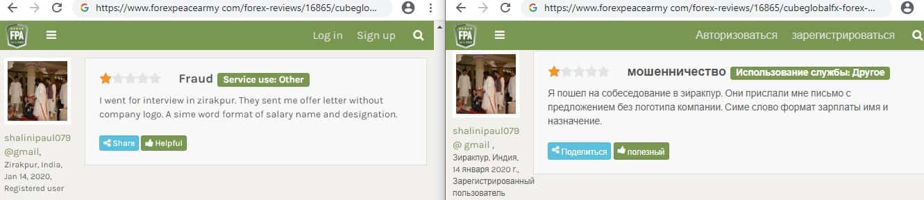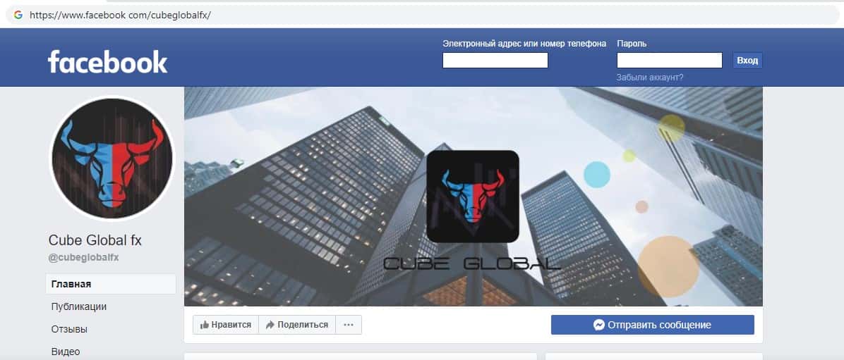 Одна из самых больших социальных сетей фэйсбук, совсем не благосклонна к аферистам CubeGlobalFX так как подписчиков тут совсем мало а соответственно интересуются мошенниками только самые наивные пользователи. В то время все остальные знают самую главную истину то, что не нужно сотрудничать с лохотроном Куб Глобал ФХ.