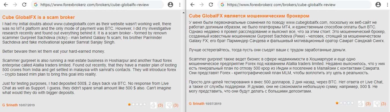 Негативный отзыв о аферистах CubGlobalFX с уважаемого сайта на котором публикуют все правдивые отзывы о компаниях мошенников, уже говорит о многом. Соответственно если подвальный сайт Куб Глобал ФХ не может пройти внешнюю проверку, то не возможно говорить о какой то гарантии или качестве сайта.