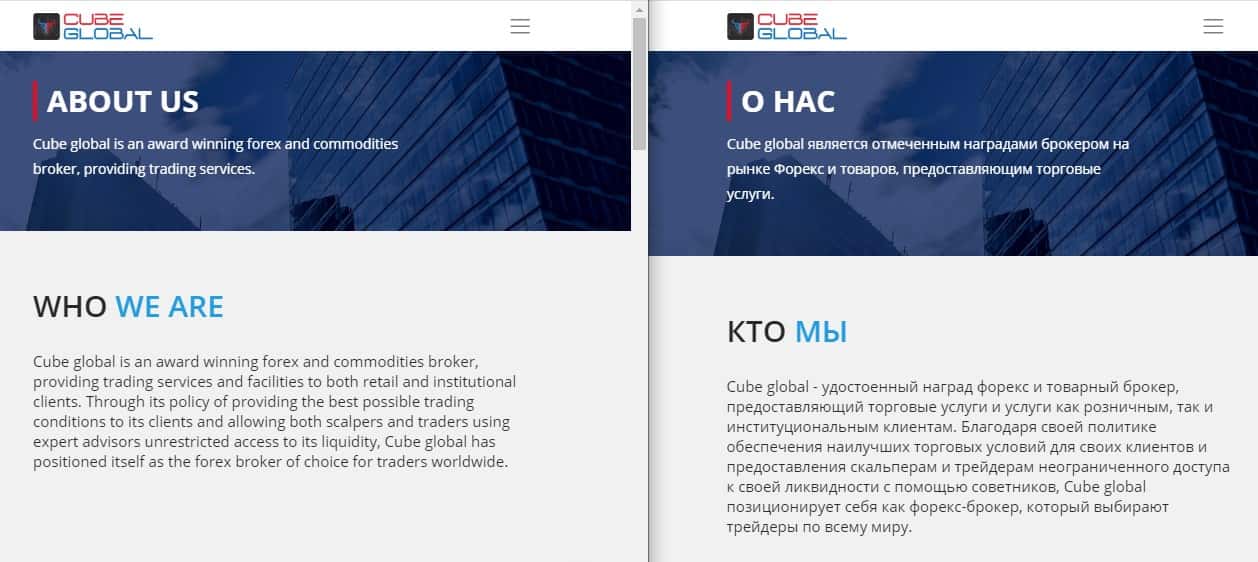 Наверное самый лживый раздел сайта мошенников CubeGlobalFX < в котором он рассказывает о себе. Каждая строка данного раздела пропитана ложью и непонятной информацией. Где они рассказывают какие они хорошие, честные и профессионалы. Но не пишут о то как они обманывают клиентов и сливают их деньги.