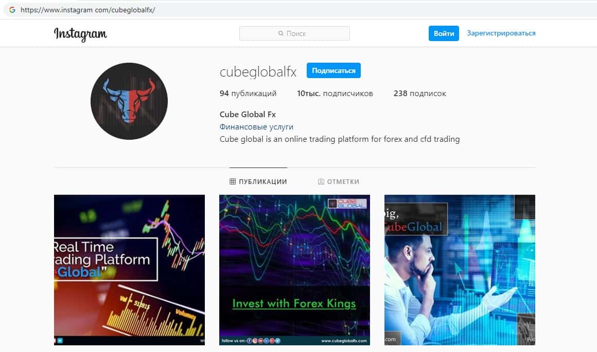 Так как в данный момент проходит рассвет мобильного приложения инстаграмм и там ноходится самая большая часть населения, они сделали страницу на этом ресурсе. Но как бы аферисты Куб Глобал ФХ не хотели забрать больше денег, доверчивых лохов у них мало и таким образом на портале инстаграм у них всего 238 подписчиков.
