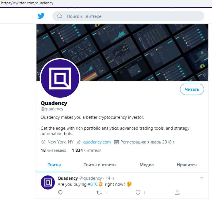 Дабы соответствовать современным трендам мошенники Кваденси обзавелись страницами в различных социальных сетях, одной из которых стал Twitter, где у аферистов Quadency имеется несколько тысяч подписчиков, что говорит о довольно низкой популярности аферистов Quadency на просторах сети интернет, что вы можете увидеть на изображении ниже.