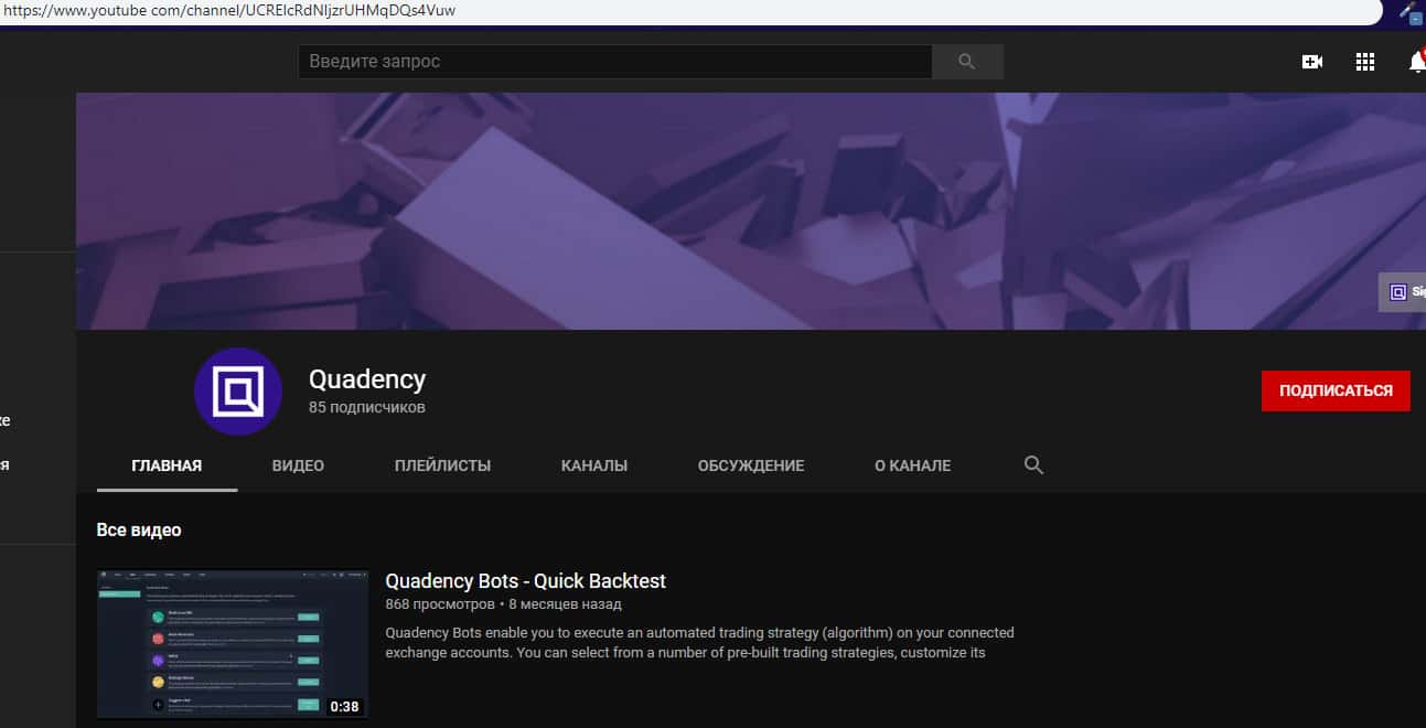 Для размещения различных мотивационных видеороликов с лапшой на уши наивной клиентуре аферисты Quadency обзавелись страницей в социальной сети YouTube, где у мошенников Кваденси имеется всего около сотни подписчиков. На изображении, расположенном ниже, вы можете увидеть страницу аферистов Quadency с Ютубе.
