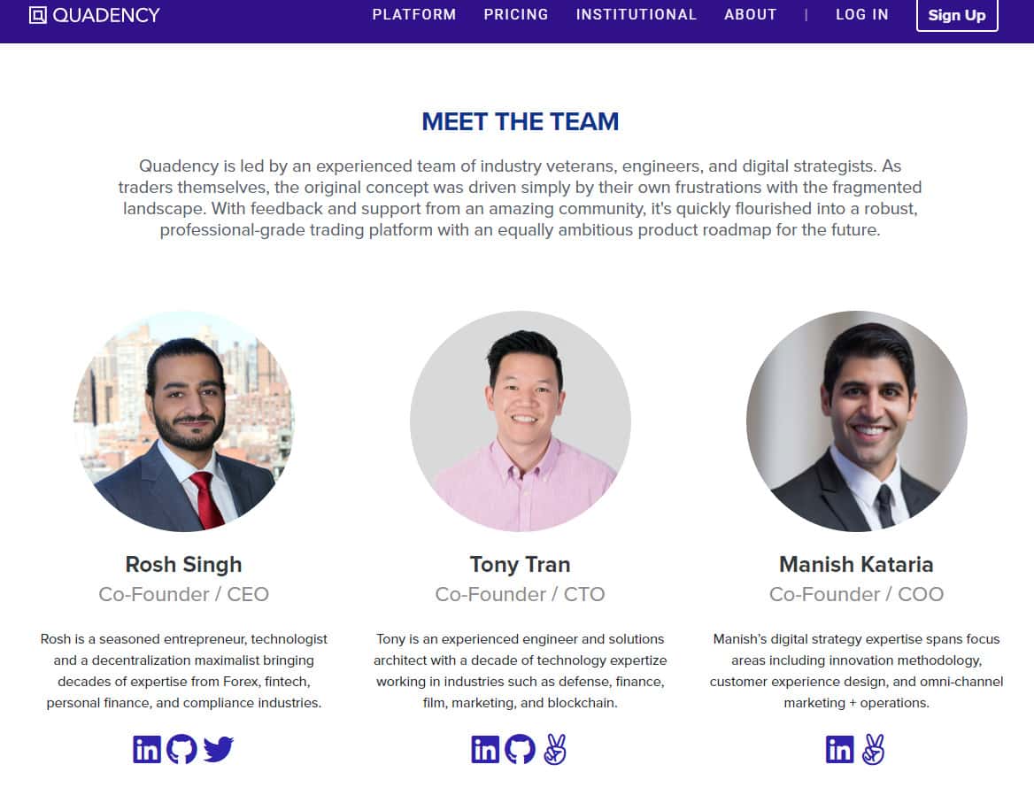 Под своих руководителей аферисты Quadency отвели отдельный раздел своего подвального сайта, где указали довольно мало личностей, да и к тому же никаких гарантий их реального существования на работе у мошенников Кваденси нету, поэтому особо надеяться особого смысла нету. Итак ниже перечислим указанных аферистами личностей: