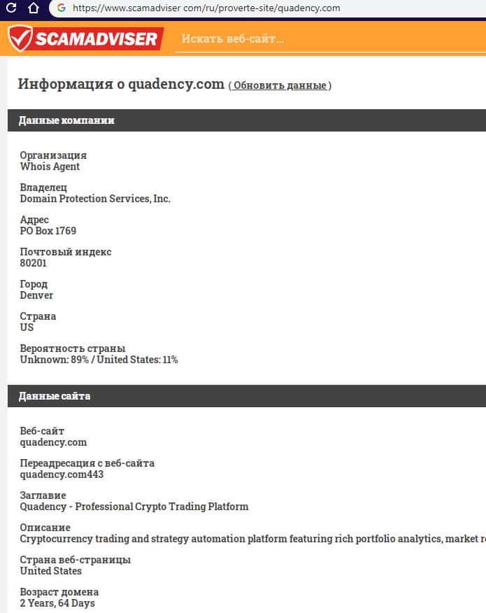 Техническую же информацию о подвальном сайте мошенников Quadency можно узнать непосредственно с помощью веб-сайта scamadviser com, где расположена информация о стране регистрации домена, а так же его возрасте, который составляет несколько лет. На изображении ниже вы можете увидеть информацию о сайте шулеров Кваденси.