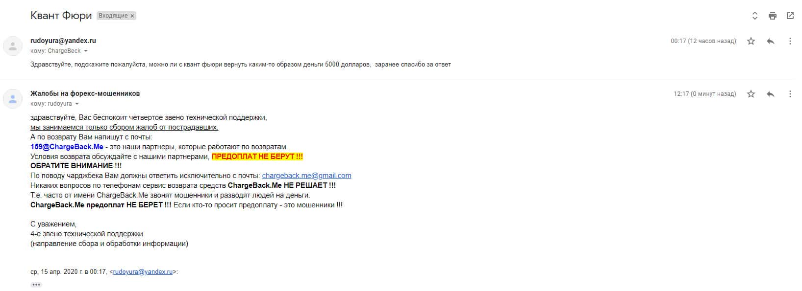 О том, что аферистов в лице организации Кванту Фюри кинули интерне-пользователя на сумму в размере 5000 долларов США, можно узнать, ознакомившись с жалобой, опубликованной далее, данный информационный материал пришел на емайл веб-площадки, разоблачающей деятельность аферистов во всемирной сети.