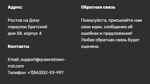 - электронная почта - support@queenstown-rnd com;