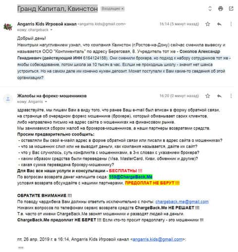 На публикации ниже представлена жалоба от одного из столкнувшихся людей с мошенниками Квинстон, он же Гранд Капитал. В ответном письме человеку была выслана рекомендация по поводу обращения в службу ChargeBack.Me которая помогает возвращать утраченные деньги на Форекс.