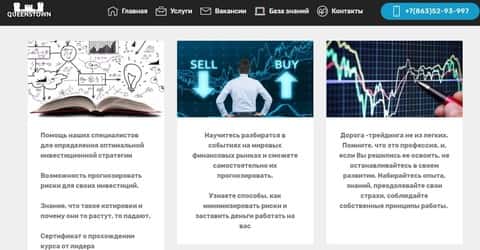 Сайт у мошенников Квинстон довольно старо выглядит, дешево сделан и усыпан довольно не однозначными слоганами. Особенно стоит уделить внимание начальной фразе жуликов Квинстон, в которой говорится, что вы будете получать индивидуальную стратегию от лучших аналитиков центра (а есть и худшие?), но тут же говорят что вы будете выбирать прибыль сами, то есть торговать. Непонятно то ли вас научат торговли, то ли вам будут торговать сами менеджеры аферисты Квинстон.