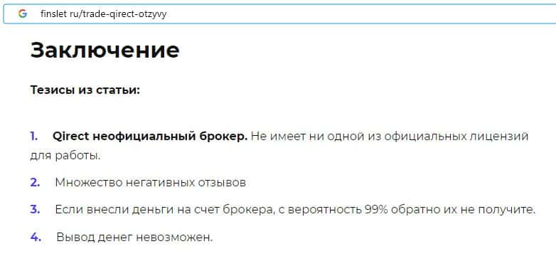 У скам-организации Qirect нет лицензии на предоставление брокерской деятельности, слишком велика вероятность того, что вернуть свои вложенные деньги не получится.